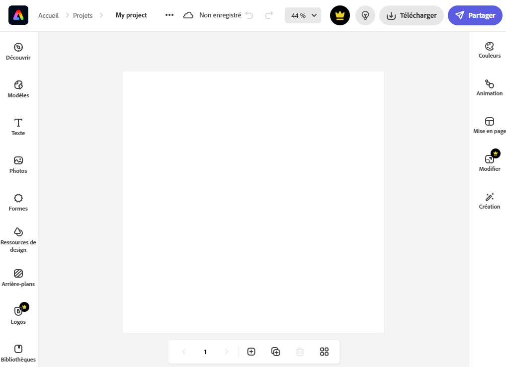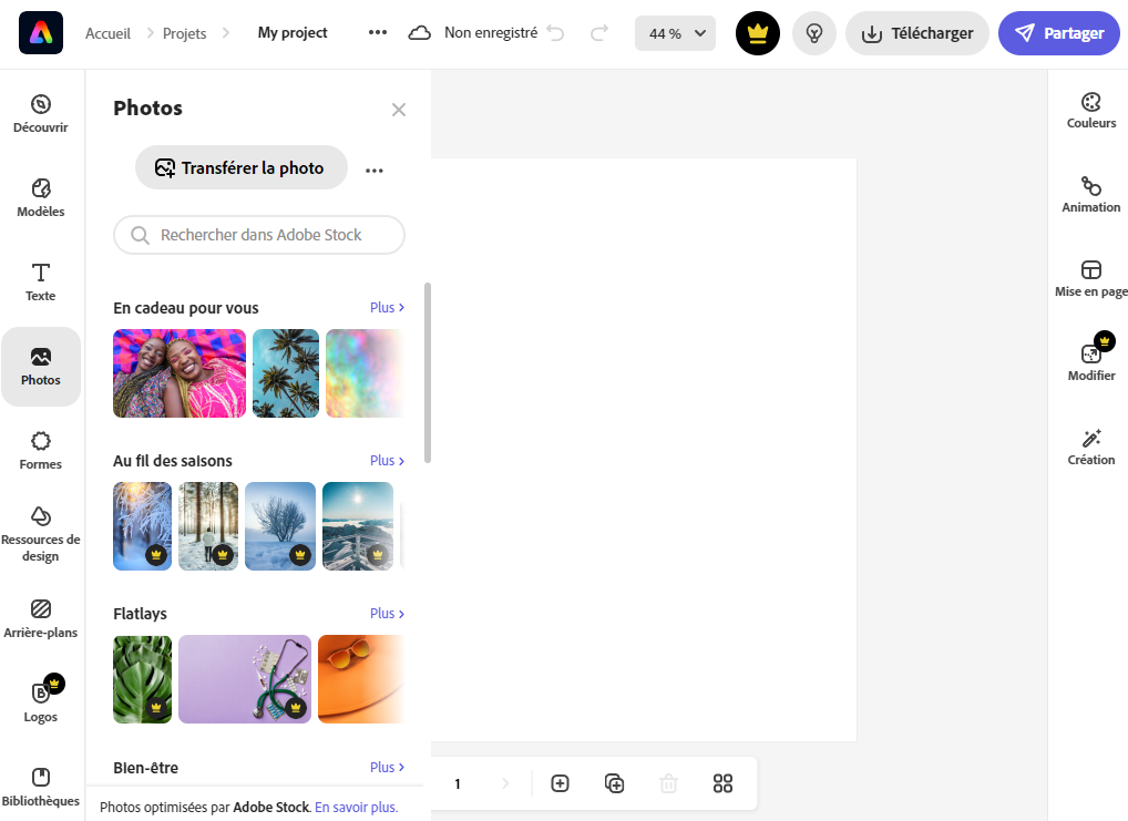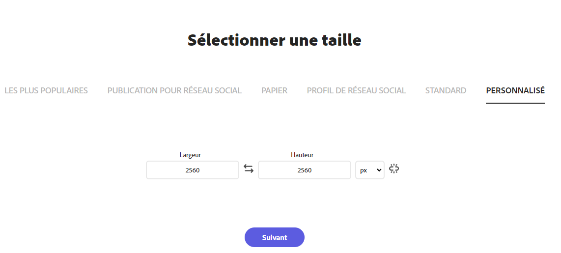 6. L’espace de travail d’Adobe express apparaît. Au centre, le plan de travail blanc possède les mesures que je viens de rentrer.