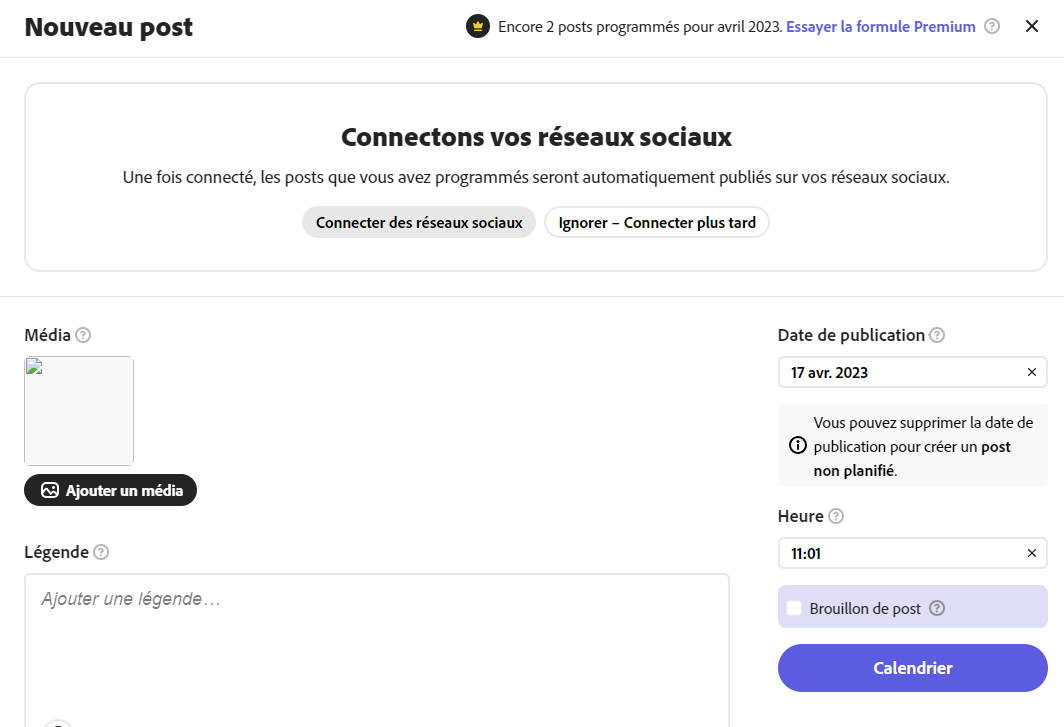 Si je veux, je peux programmer ma publication dans la section calendrier (à droite)