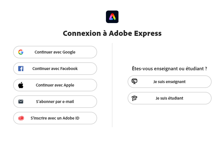 L’utilisation de l’outil requiert un compte utilisateur. Vous pouvez vous connecter avec votre compte Google (Gmail). Adobe express est une version grand public des logiciels de la marque Adobe dédiée au graphisme. Elle est une plateforme, un logiciel Windows et une application mobile Android et IOS .